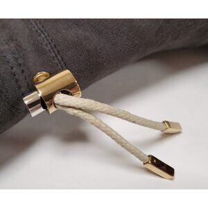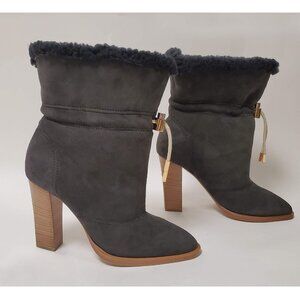 Unique Features: Stacked Wooden Heel and Soft Charcoal Grey Suede Shearling make these Chloe's Drawstring Ankle Boots the Ultimate Winter Pair. Lined in the Softest Sheepskin for Extra Warmth and can be worn Full Length OR Folded Over. Sheapsking Lining and Trimmed Top Edge. Drawstring Ankle Feature, Gold Tone Metal Toggle. Almond Toe, Stacked Wooden Block Heel. Pull On.
