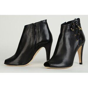 Unique Features: Ankle Boots, Open Toeline, Inner Zip Closure, Faux Lace0up Detail on Side with Bow Adorned with Contrasting Goldtone Hardware Chain. Stacked High Heel