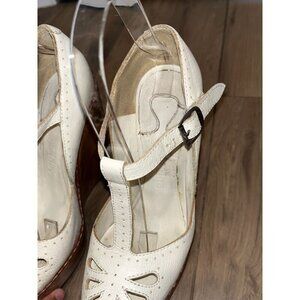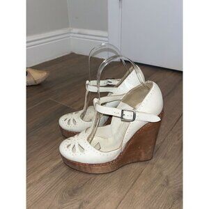 These white leather wedge heels offer a secure fit with adjustable buckles and a stylish cutout design. Their wooden wedge adds a natural and modern aesthetic.
