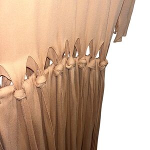 Turn heads in this stunning CHLOE Sleeveless Fringe Maxi Dress, a perfect blend of effortless boho charm and refined luxury. Crafted from a soft, breathable knit in warm beige and tan tones, this dress drapes beautifully, skimming the figure before flowing into dramatic fringe detailing that moves gracefully with every step. Designed for both resort escapes and chic city strolls, its sleeveless silhouette and full-length hem make it versatile for day-to-night wear. Pair it with flat sandals for a relaxed vacation vibe or elevate it with strappy heels and statement jewelry for evening elegance. -color: Smoked Ochre (a peachy tan) -size: French 38 = US 6 -MSRP: $3250 -condition: new with tags -measurements Pit to pit 15” Waist 13” across Length approx 60” This is a timeless statement piece that channels free-spirited sophistication—perfect for summer getaways, destination weddings, or stylish evenings under the stars.