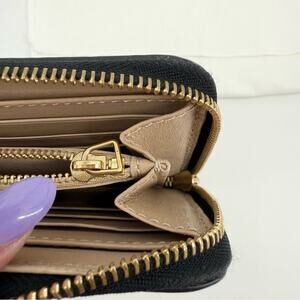 Sleek zip-around wallet made from pebbled leather with goldtone hardware.