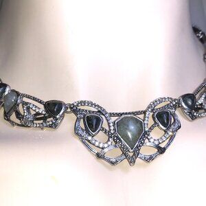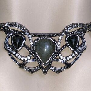 Each stone is uniquely cut—teardrops, ovals, and shield shapes—adding depth and organic elegance. Surrounding each gemstone, shimmering hand-set pavé crystals highlight the intricate geometric metalwork, catching the light with a refined, icy brilliance. The cool gunmetal-tone finish enhances the necklace’s mysterious, romantic allure.