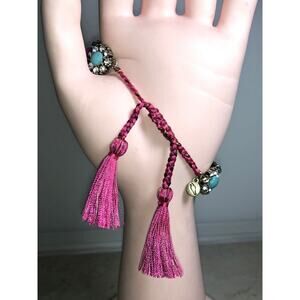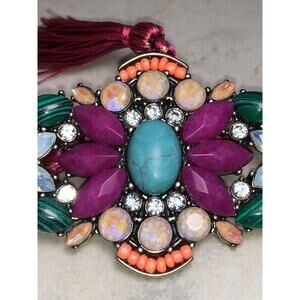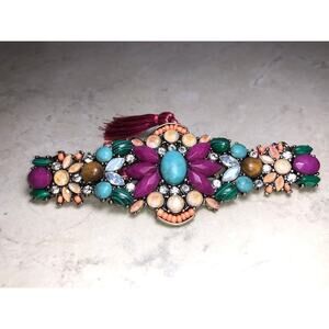 Bursting with rich color and botanical-inspired beauty, our Jardin Gemstone Bloom Statement Bracelet is a true wearable garden masterpiece. A dazzling medley of jewel-tone stones forms an ornate floral centerpiece—featuring turquoise, malachite-style greens, vivid magenta marquise gems, iridescent crystals, warm amber accents, and soft coral beading.