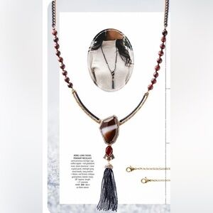 semi-precious red tiger eye, coffee agate + red goldstone resin, black diamond + clear crystal pavé, midnight gray seed beads, navy leather + ribbon, red thread