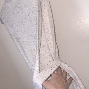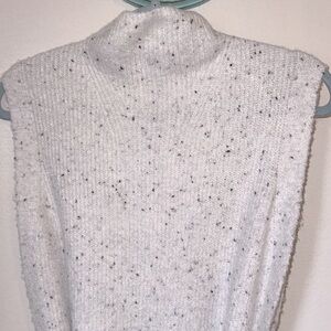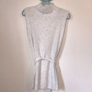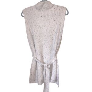 Chic sleeveless knit turtleneck sweater vest in a soft cream color. Features a stylish side slit and a matching belt for a flattering fit. Open down sides, belt ties around.