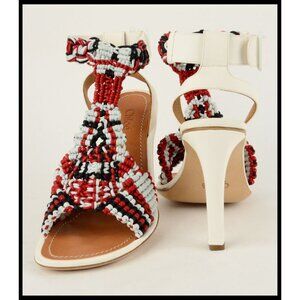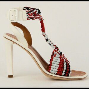 Unique Features: High Heel 'Tribal' Sandal with Multi colored Straps / Intricately Woven Crochet. Open Toeline with White Ankle Strap. Crochet Waxed Lacing and Calfskin for the T-Strap