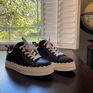 Elegant black animal print leather CHLOE sneakers. Round toe platform women’s shoes in very, very good condition! Originally sold for $595, true to size