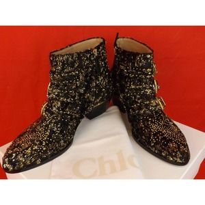 CHLOE SUSANNA BLACK VELVET GOLD STUDS BUCKLES MOTORCYCLE ANKLE BOOTS 40.5 10.5