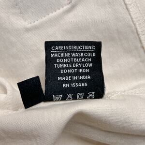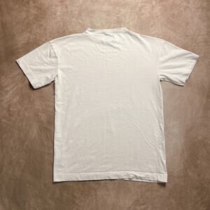 Off white / cream color with large black & red print of a face and text. Short sleeves, crew neckline. Has an oversized loose fit.