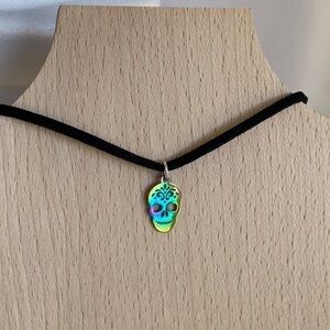 Necklace features a black suede cord with 925 lobster clasp, 1.5” extender and a colorful dual sided stainless steel skull pendant