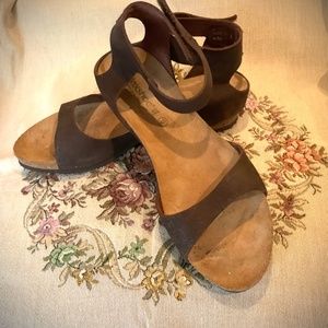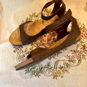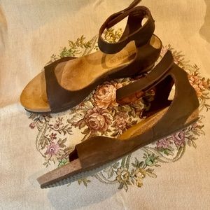 Perfect summer color, chocolate Nubuck brown soft and supple suede sandals with Velcro fastener at ankle. Shoe has lightweight cork sole lined with suede. Size 40 usually fits size 9. This is a lightweight shoe with a tin textured sole to avoid slips. They are cute, lightweight & packable (take them in your p handbag) The look and color goes with everything plus easy on and off. They are in gently used condition . A sacrifice because I love the look but can no longer wear this fit. Brand is RELAXSHOE. Thanks for looking.
