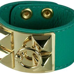 DESIGNER INSPIRED, ORANGE, RED, OR TURQUOISE LEATHER BRACELET WITH GOLD RING ACCENT LENGTH: 2 SETS OF SNAPS SO IT FITS; 6″ to 8″ INCHES WIDTH: 1 1/2″ INCHES LAST PIECES FOR SALE THE SNAPS ARE ALITTLE DISCOLORED
