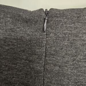 This is a charcoal-colored sheath dress made by Designer Chris McLaughlin. It features a scoop neck, zip closure, and 3/4 dolman sleeves. The dress is knee-length and has tailored pleats in the back with studded accents down the arms and at the waist/hips. It is lined, collarless, and has stretch fabric consisting of polyester, rayon, and spandex. The dress is suitable for career, church, workwear, and business occasions, and is ideal for fall and winter seasons. It should be hand-washed only. The dress is size 8 and has a regular size type.