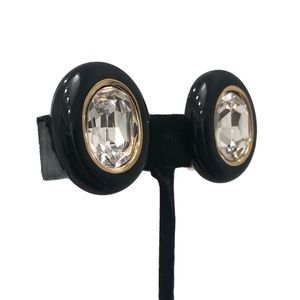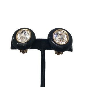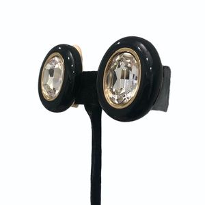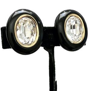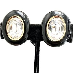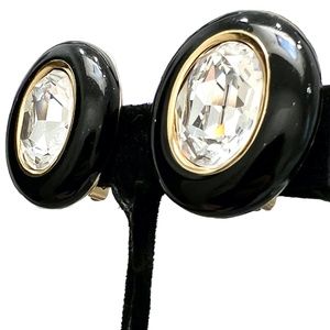 CHRISTIAN DIOR BLACK ENAMEL & FACETED CRYSTAL OVAL CLIP ON EARRINGS