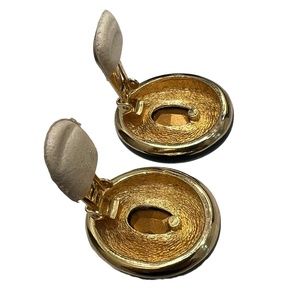 Vintage Christian Dior clip on earring in black enamel with center multifaceted crystal stone bezel set in gold tone. Small surface scratches on the black area from wear - really only visible from up close and with direct light. Otherwise, they are in very good preowned condition. 1.25”L X 1”W