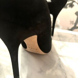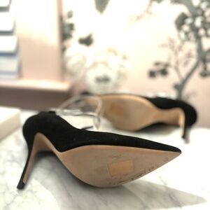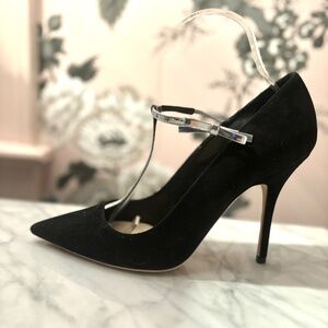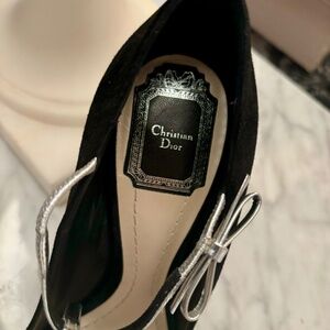CHRISTIAN DIOR BLACK SUEDE HEELS SHOES WITH METALLIC T STRAP AND BOW - SIZE 38.5