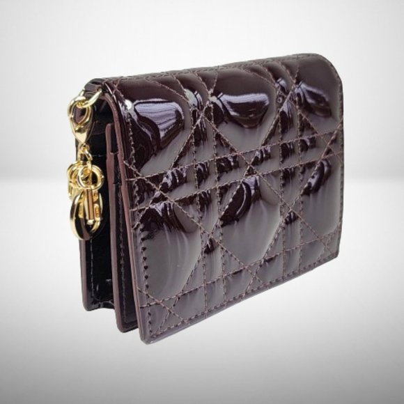 CHRISTIAN DIOR BURGUNDY WINE PATENT CANNAGE WALLET WITH REMOVABLE CHARM