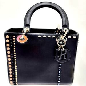 CHRISTIAN DIOR Black Leather Studs Embellished Medium Lady Dior Tote RARE