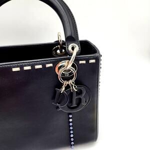 This rare, limited edition Christian Dior black/blue leather medium sized Lady Dior Bag with studded embellishments and crystals. The studs and crystals on the bag are stunning. They're in a variety of sizes and colors. Check pictures for details. The bag is in very good condition. Some minor scratches to the leather interior from paper used to hold shape. Minor discoloration to hardware attaching the leather Dior letters. Shown in pictures. Comes with original crossbody strap. Made in Italy. November of 2015. Comes with COA. L 9" x H 8" x3 W. Minimal signs of usage