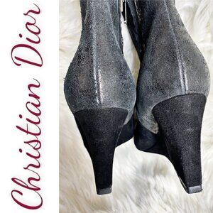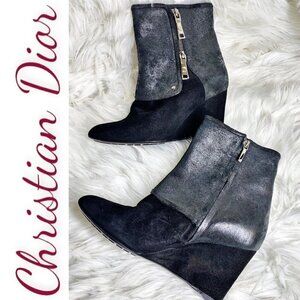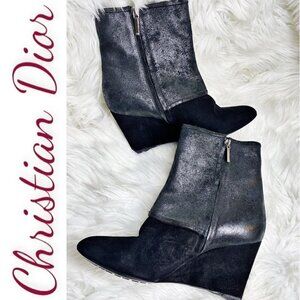 CHRISTIAN DIOR Black Suede Wedge Metallic Ankle Boots, Size 9.5
