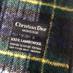 CHRISTIAN DIOR Monsieur scarf is a timeless piece with a heritage-rich aesthetic evocative of Scottish clan textiles. Classic tartan plaid in deep forest green, navy blue, white, and golden yellow, creating a balanced contrast between cool and warm tones giving it a refined, understated elegance.The texture is brushed and slightly fuzzy, providing warmth and a luxurious handfeel perfect for layering. Woven in Great Britain from a soft 100% lambswool. 10 Inch X 56 Inch Long plus 3 Inch fringes at both ends. NEW without Tag.