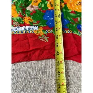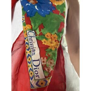Multicolor silk CHRISTIAN DIOR scarf. Red border and multicolored floral background. Registration of the mark in the bottom right of the scarf.