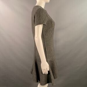 CHRISTIAN DIOR PARIS dress in a grey and black textured wool featuring short sleeves, knee length tulip skirt, and invisible back zipper closure. Made in Italy.