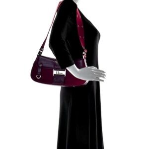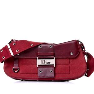 This is an authentic CHRISTIAN DIOR Canvas Calfskin Street Chic Columbus Ave in Burgundy. This fabulous shoulder bag is crafted of burgundy canvas. This handbag feature a red calfskin leather front flap, trim, and adjustable shoulder strap. The interior reveals a red Dior monogram fabric interior with a zipper pocket.