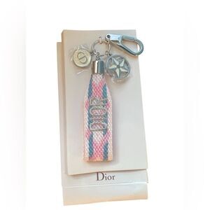 Pink and aqua woven Christian Dior keychain with logo at strap and lobster clasp closure at top. Includes box