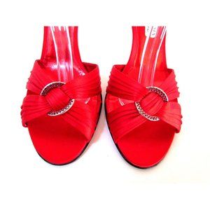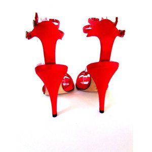 CHRISTIAN LACROIX RED SATIN OPEN TOE ANKLE STRAP DESIGNER SANDALS 8.5.MED