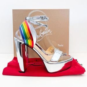 Christian Louboutin's Arkendisc Alta sandals made in Italy from silver metallic chrome finished leather and feature a bold rainbow strap at the heel. They're set on a dramatic 130mm block heel that's balanced by a 35mm platform and have the signature red lacquered soles. New in box.