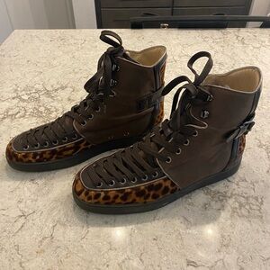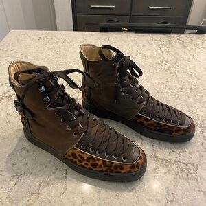 CHRISTIAN LOUBOUTIN Brown Léopard Calf Hair High Top Sneakers EU 43