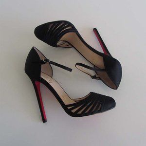 Beautiful black satin CHRISTIAN LOUBOUTIN ( Style: En Passant ) classic pumps with layered accent at toebox, side buckle closure at adjustable ankle strap, rounded toe, soft leather insole, red glossy leather sole and 5" high covered stiletto heel. Made In Italy. Size: 37 ( Louboutin ) Or 7 ( US ). Retail: $780. Condition: New without the box.