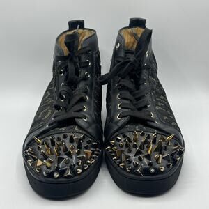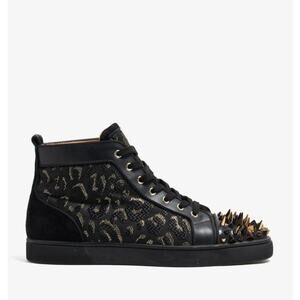 The Louis sneaker is a Hi-top sneaker with a sleek, minimal silhouette and a flat rubber sole. First released in 2009, it has become a cult style and features new iterations as the seasons pass. This classic style exudes elegance in all-over black and jacquard gold detailing. Crafted from exquisite calfskin leather it has a signature red sole to create a striking contrast, along with fierce spikes for elevated attitude.