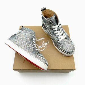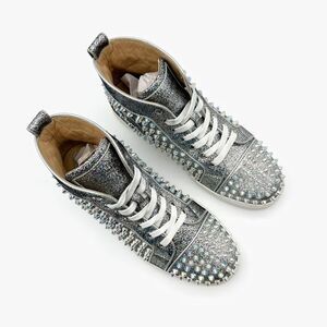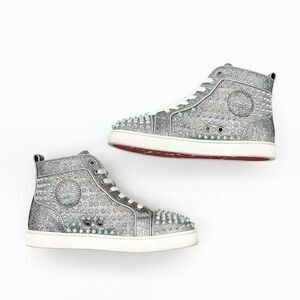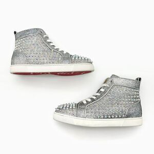 Christian Louboutin Louis Orlato Flat Nappa Mica Spike High Top Sneakers crafted in shimmering silver mica leather uppers. These statement sneakers feature signature spiked embellishments throughout, iridescent crystal accents, and the iconic Louboutin crest logo on the side. Designed with a classic lace-up closure, they combine bold edge with refined craftsmanship.