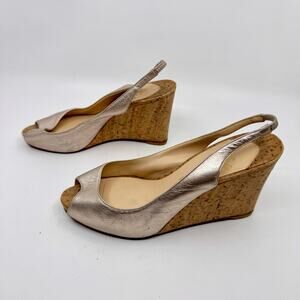 Details: Authentic red bottoms; cork wedge heels from Christian Louboutin Paris. Metallic rose gold leather upper with easy-on slingback straps and a peep toe. Moderate heel height. Sexy, luxurious, and summer/vacation ready! Comes with protective Vibram sole protector (I do not know the condition underneath). Info on sole is covered but certainly Made in Italy.