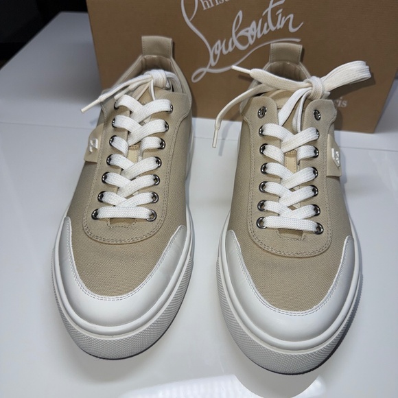 100% authentic CHRISTIAN LOUBOUTIN Canvas and leather Simplerui Flat Calf Low Top Sneakers Size EU 40.5 in Bianco/beige