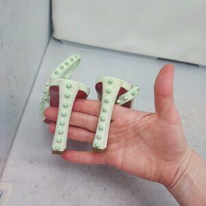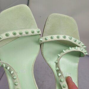 These heels feature ankle and toe straps lined in light green metallic spike