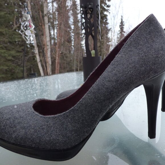 Worn in the house for about 3min. Can't walk in shoes that high. They have been stored for a while, so I decided to sell them. Stunning Heels! The gray material feels like felt to me. Must see and must have.