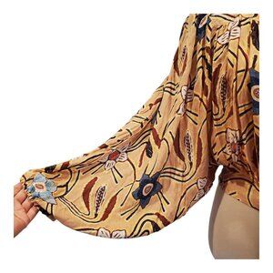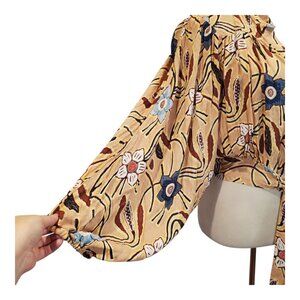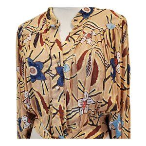 Christian Siriano New York women's long sleeve button-up top in size L. The top is made of a lightweight, flowy 100% Rayon fabric with a floral print in shades of Brown, blue, and red. It features a mandarin collar, a button-up front, and a tie at the waist. The sleeves are long dolman and have a slight puff at the shoulder. The top is in excellent condition and has no visible imperfections.