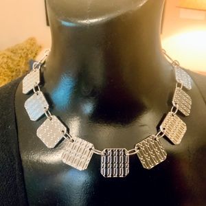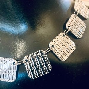 ⭐️ Textured SILVER tone metal SQUARE 3/4 “ medallions are linked together to create this beautiful piece which lays flat on the neck