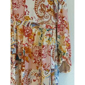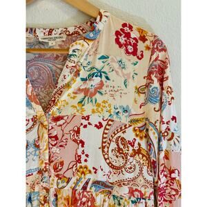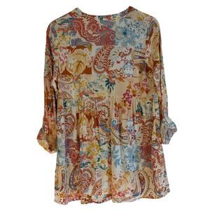 Christian Siriano New York women’s tunic top, size Small. Gorgeous paisley and floral patchwork-style print in pink, baby blue, and orange with a breezy, boho-inspired design. Features a loose babydoll silhouette, 3/4 button sleeves, and lightweight 100% rayon fabric that’s breathable and comfortable. Could also work as a maternity-friendly piece thanks to its flowy fit.