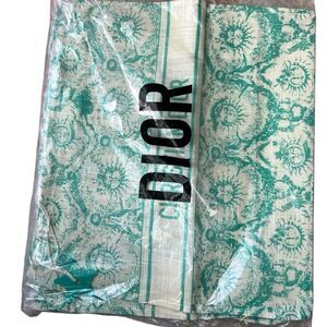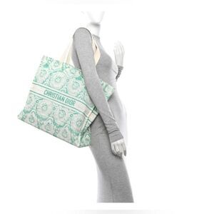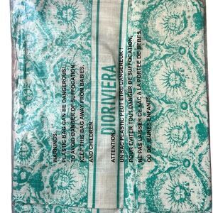 This is an authentic CHRISTIAN DIOR Canvas Dioriviera Toile de Jouy Soleil Tote in Aquamarina. This stylish bag is crafted of straw with a printed of green design. The bag features beige shoulder straps and the top opens to a spacious interior with a removable insert.