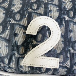 Features : Rare Christian Dior nylon belt bag ; designed by John Galliano circa 2003 and made in Spain , crafted from nylon material with white leather trim , features the signature Trotter monogram pattern in navy and white , signature number motif , adjustable waist strap , two back zip pockets , silver hardware. This Dior bag is small , convenient and easy to carry ; it fits a small bottle of sunscreen, a small wallet , your phone and a lipstick. The perfect bag for easy breezy vacation days or hands free errand days.