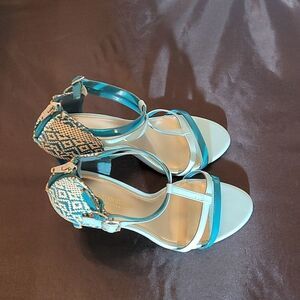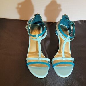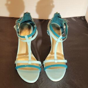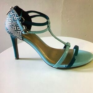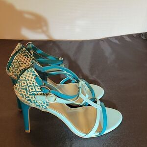 CHRISTIAN SIRIANO WOMEN"S " HEEL IN TEAL LIGHT BLUE SIZE 10 Amp up your look with effortlessly chic style in the Heather Heel from designer Christian Siriano. It features a tumbled, strappy upper, adjustable strap with buckle, ankle cage with zip, 3 3/4" wrapped heel, jersey lining, padded insole, and a rubber outsole. Manmade materials.THIS ITEMS IS PRE-OWNED EXCELLENT CONDITION YOU MIGHT MISTAKE FOR NEW CHECK THE PICTURES.