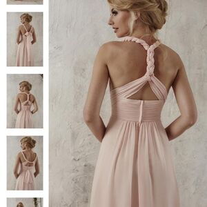 bridesmaid, wedding, party, tea party, feminine, pretty in pink, pastel, spring, summer, coquette girl, girly, chiffon, blush, elegant, event special occasion, gown, gowns, bow, light pink, maid of honor, knee length, Empire waist, halter top, modern romance, princess aesthetic, Coquetteaesthetic, fairy, enchanting