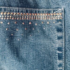 These Christine Alexander jeans feature a stylish flare wide leg design, crafted in a classic blue denim. Medium rise. Embellished with Swarovski crystals and metal studs, they create fun sparkle as you move around. If you're familiar with this brand, then you know it is a great quality product. Medium weight, mostly cotton with a smidge of spandex for comfort. They won't stretch out and get baggy! These are in beautiful condition.