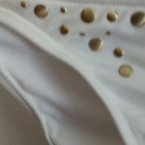 Grommet studs and Volcom signature logo make a traditional white bikini High-Octane Edgy!