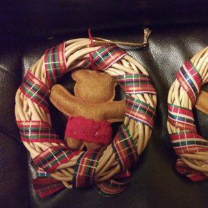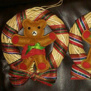 Two cute handmade teddy bear wreaths. One male, one female. The wreaths are wicker, the bears are felt, wrapped in ribbon. It is a set of two (2). They are 6" x 6".