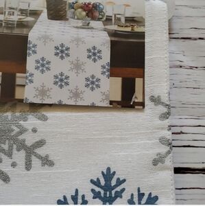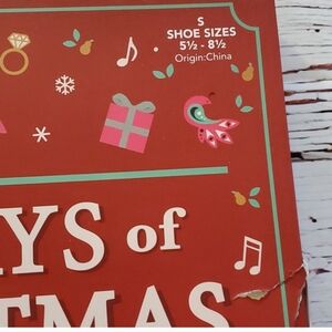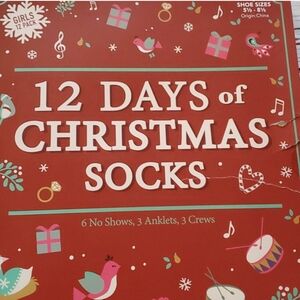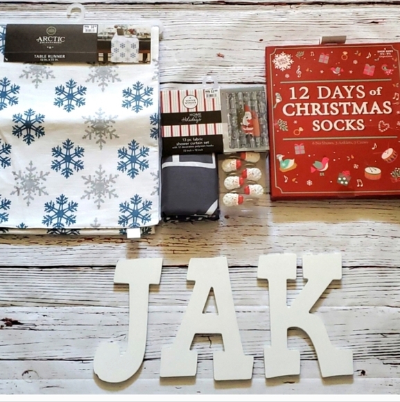 All brand new. Comes with 12 days of socks (girl sizes). Some damage to box, but completely brand new. Gray fabric shower curtain with cute Santa hooks. The last one is a white table runner with snowflake design.